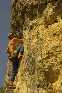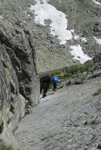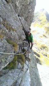 Dwie krótkie ale wymagające drogi na południowej ścianie Prawego Siekacza: Lewy urwis: wycena V-, lewa strona płytki, u góry z użyciem ryski