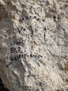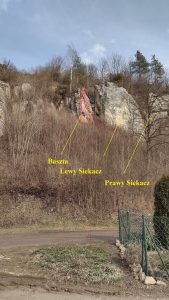 Na sąsiadującej z Lewym Siekaczem wychodni skalnej, do której przylgnęła nazwa „Baszta” zrobiło się … tłoczno od inicjatyw. Adam (adamszymanski1223@gmail.com), który oczyścił skałkę z kruszyzny i ziemi, odkrzaczył teren u podstawy oraz wyznaczył na „Baszcie” dwie linie wspinania, co widać na załączonych zdjęciach, pozostawił zwyczajowy repik na znak swojej działalności. Ostatnio pojawił się na skale zapis (na zdjęciu), a repik zniknął (podobnie jak jałowiec na skale), stąd prośba o kontakt z Adamem, by ustalić dla przyzwoitości wspólne stanowisko w tej kwestii.